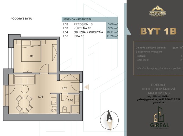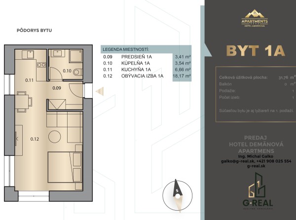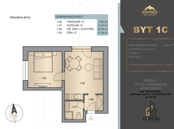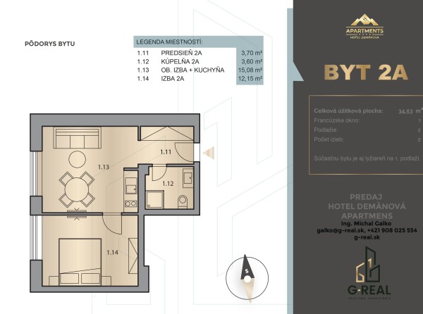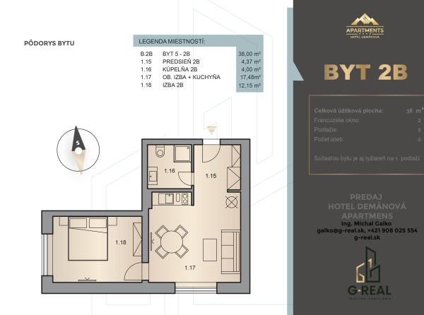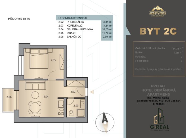 Jednoizbový štúdiový apartmán s podlahovou plochou 32 m2 nájdete na prvom poschodí. Súčasťou bytu je aj lyžiareň na prvom podlaží.