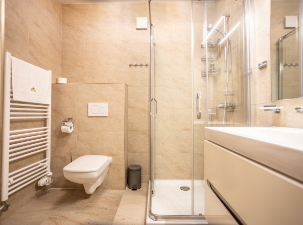Dvojizbový apartmán s dvoma veľkými francúzskymi oknami s podlahovou plochou 38 m2 sa nachádza na druhom poschodí.