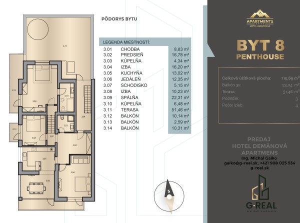 Penthouse nachádzajúci sa na treťom podlaží s celkovou úžitkovou plochou 116 m2 disponuje 4 izbami a veľkou terasou s rozlohou 51 m2.