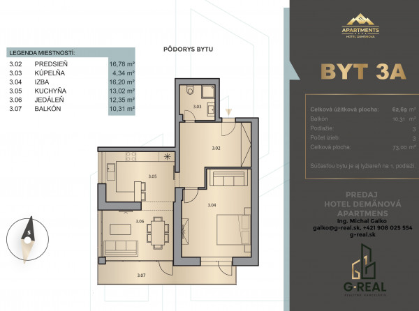 Dvojizbový apartmán s celkovou úžitkovou plochou 73,00 m² disponuje troma izbami, nachádzajúci sa na treťom podlaží s a balkónom s rozlohou 10,31 m².