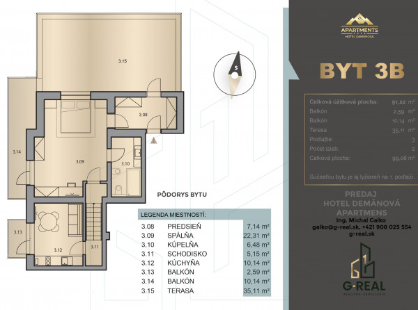 Dvojizbový apartmán s celkovou úžitkovou plochou 51,22 m² disponuje dvoma izbami, nachádzajúci sa na treťom podlaží s celkovou plochou 99,06 m² vrátane balkóna a veľkej terasy.